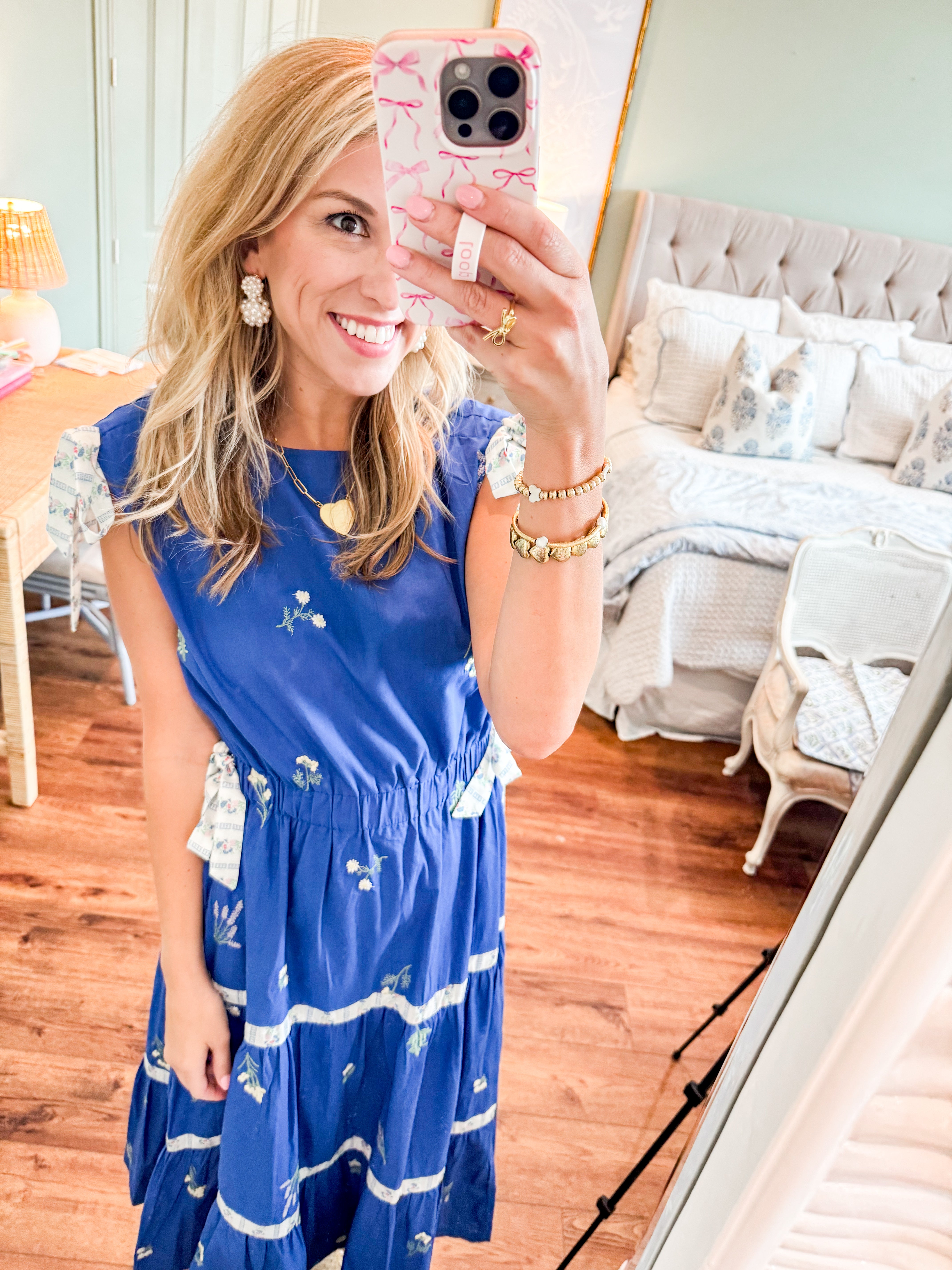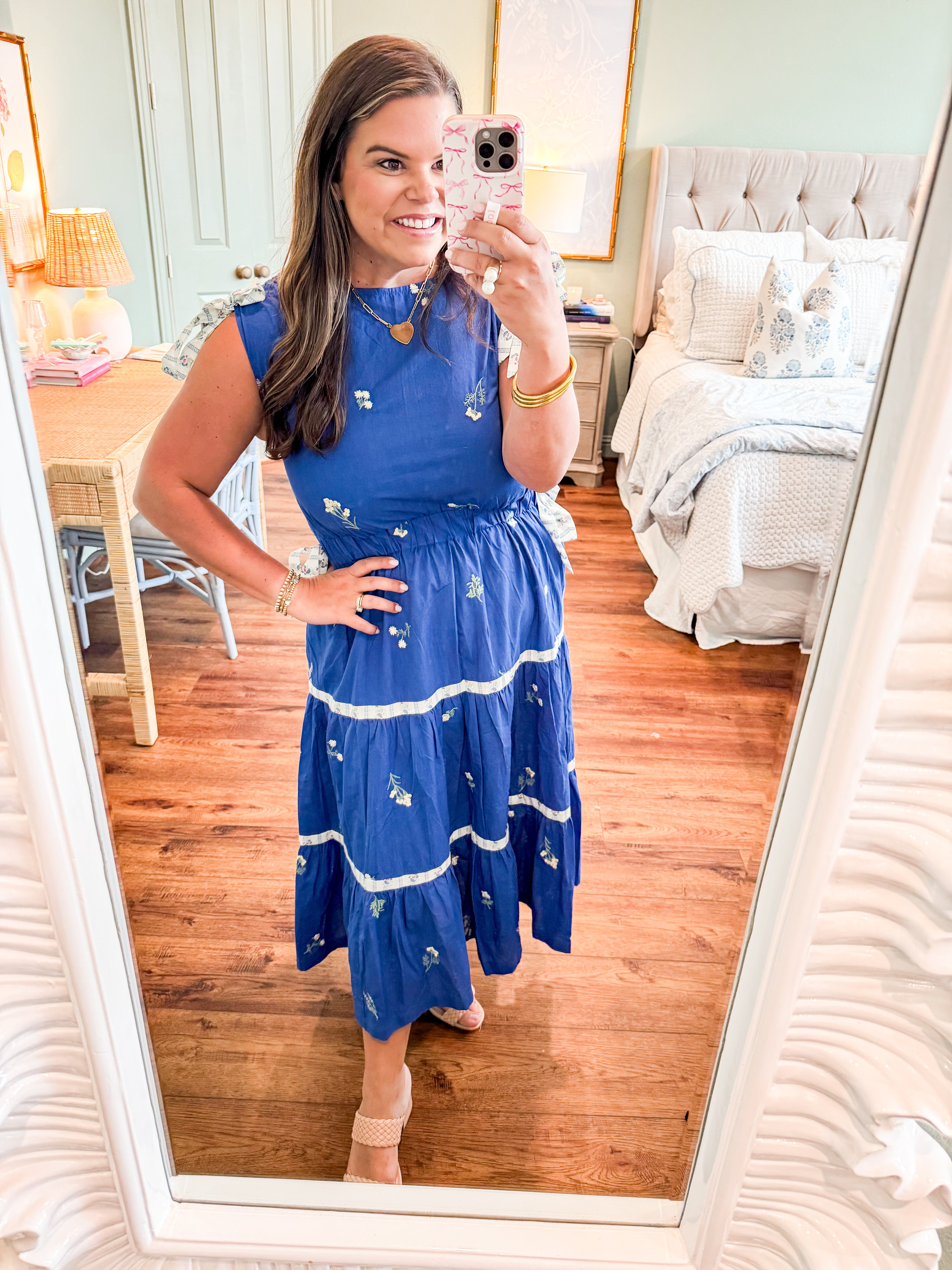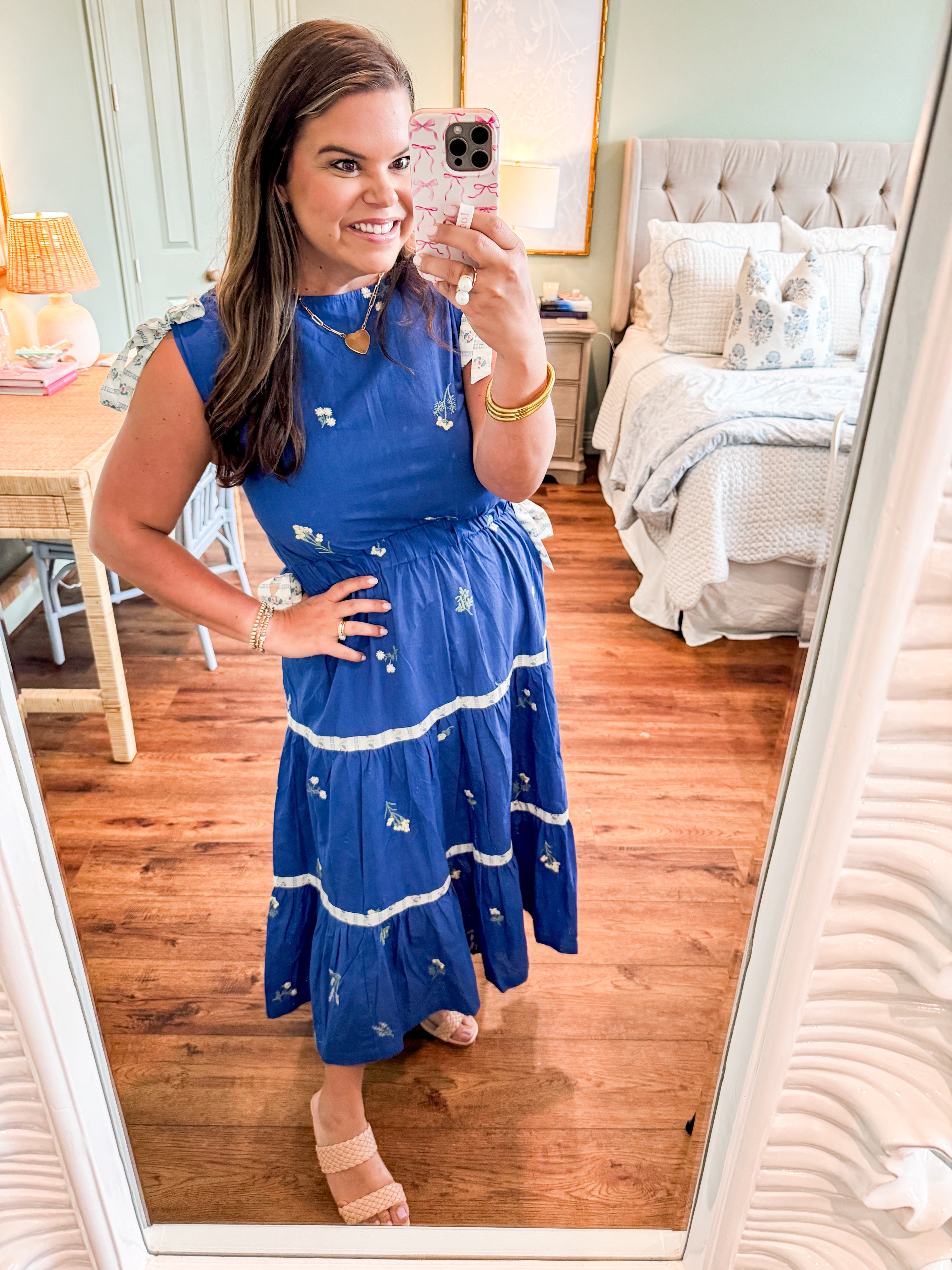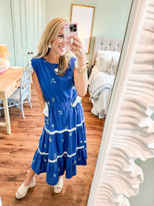 This midi dress features embroidered floral details and has tying bows at the shoulders and waist. The boat neckline and sleeveless design add a touch of elegance, while the elastic waistband provides a comfortable fit. The contrast fabric and tiered seams add a unique touch, and the dress also comes with convenient pockets. Fully lined, it also includes a keyhole back with a button closure for easy and stylish wear.