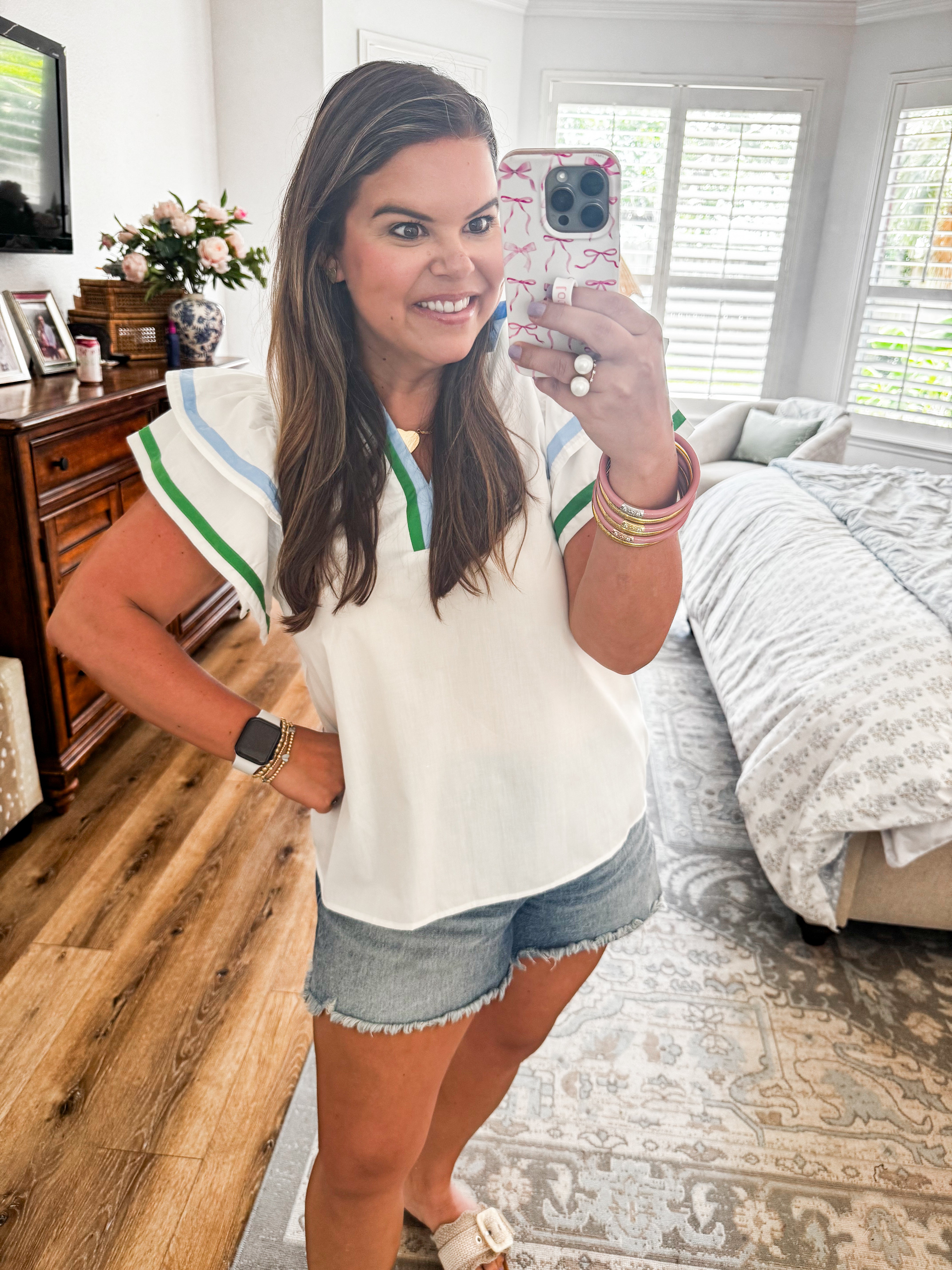 This top features a v-neck and flutter sleeves, with white fabric and accents of blue and green.
